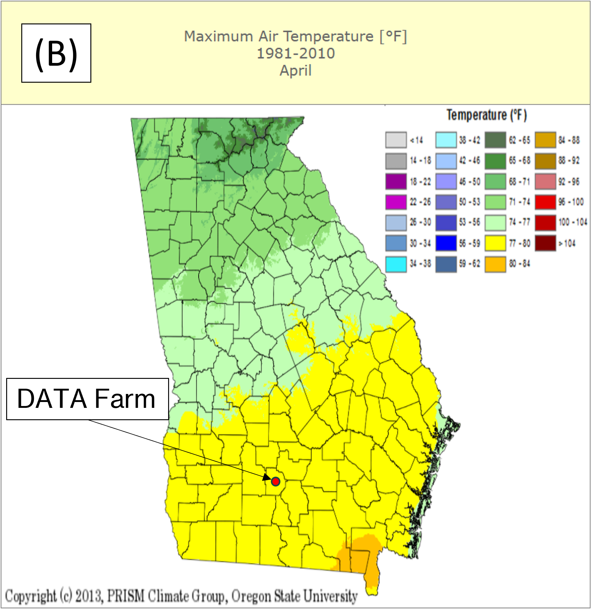 For comparison, Georgia climate maps based on data from 1981 to 2010 (UGA’s Weather Network) are shown in Figure 5 for the month of April for historical reference. The rainfall recorded at the DATA Farm during April is just above the average (2.8 to 3.2 inches) for this period. However, 2.5 inches that occurred early in the month accounts for 73% of the month’s rainfall. This has resulted in abnormally dry conditions that continue to persist in our area. The target plant date of May 1st for cotton was altered due to the dry conditions and weather forecast showing no rain for the first week of May. One of the fields planned for cotton has irrigation capabilities but we decided to wait to plant the irrigated and dryland cotton fields at the same time. This will keep field operation timing consistent during the season. The average of recorded maximum temperatures for the month was 82°F which is slightly above the average historical range (Figure 5B), and the average of recorded minimum temperatures was 70°F which is significantly higher than the average historical range (Figure 5C).