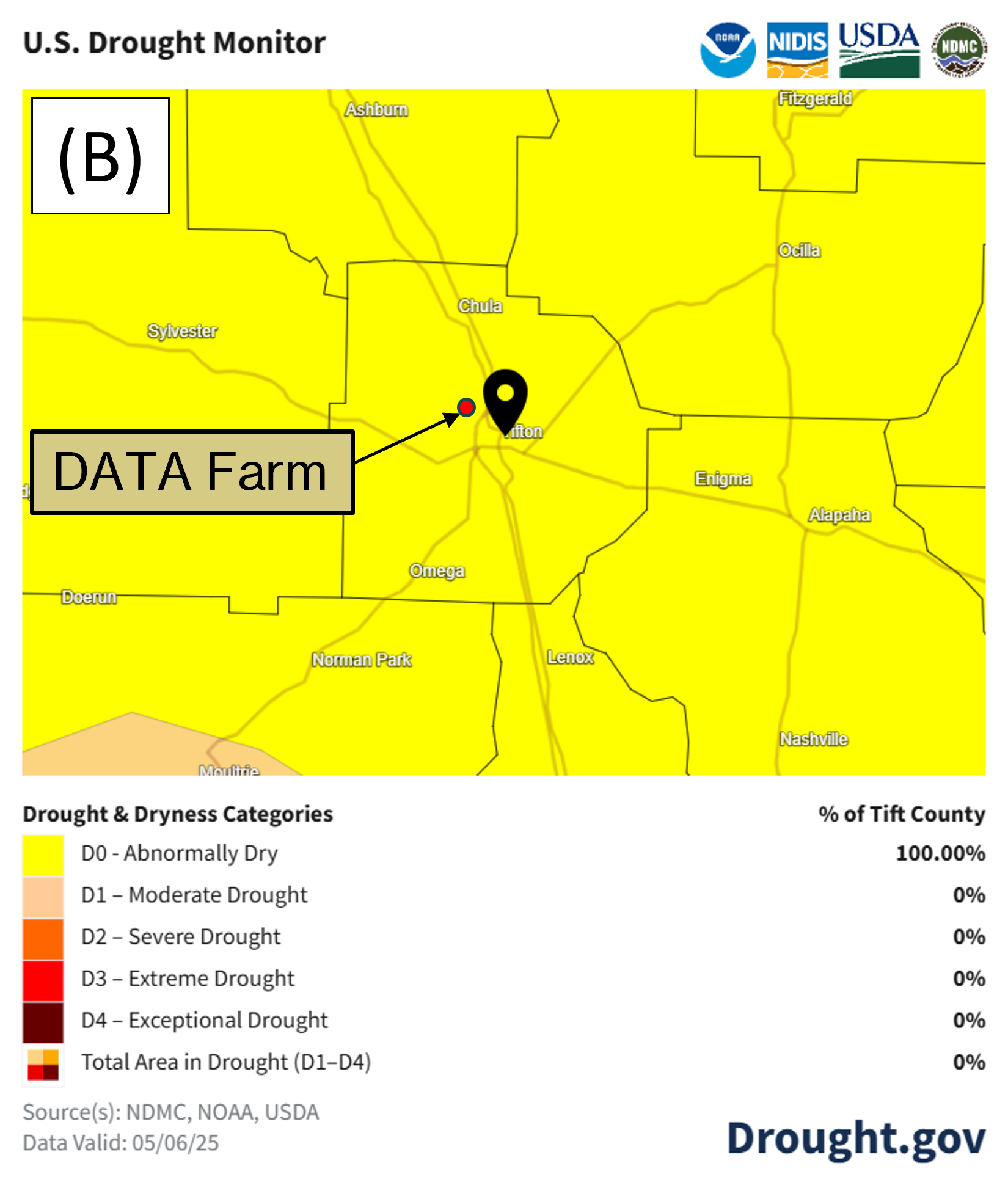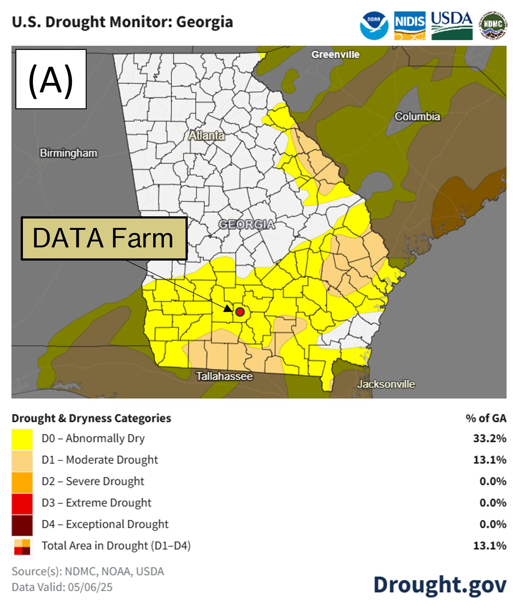 Figure 6A shows the drought monitor map as of May 6th, from the National Integrated Drought Information System for Georgia. Abnormally dry conditions are present in 33.2% of the state and moderate drought conditions decreased from 25.4% of the state on March 25th to 13.1%. Figure 6B shows drought conditions for Tift County where the 4D Farm is located. The entire county is now in mostly the abnormally dry (100%) range and no areas in the county are in the moderate drought range.